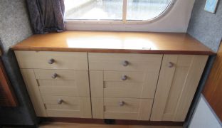 The galley is on the port side and has lots of cupboards with work top above, a full size, free standing gas cooker, a 12volt Waeco fridge and a sink and drainer with hot and cold water.