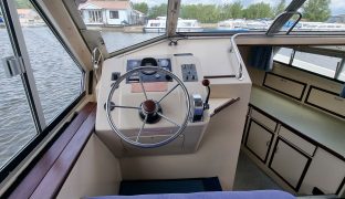 In the light and airy saloon, there is a cushioned helm seat with matching ‘L’ shaped seating in a beautiful light blue. There is plenty of floor space with a folding table that is neatly stowed away and an extra mini table. The boat is fitted with warm air heating and there is ample storage throughout.