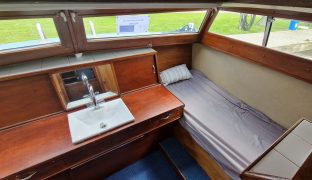 We are offering this Seamaster 30 – ‘Pollyanna’ She was built in 1970 and is powered by twin BMC engines. Entering the boat through her canopy you will find a spacious cockpit area with a captains chair and control column, on the column you will see twin throttles a large navigation wheel and various instruments. Under the hatches you will find the BMC twin engines on shafts which produce 47hp each, the starboard engine is reconditioned and was fitted in February 2023 when the port engine was also serviced, some electrics were replaced at the same time, other recent work include stern glands re-packed and bilge pumps replaced. Last anti fouled 2018